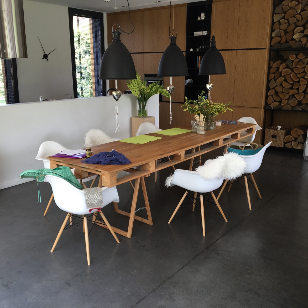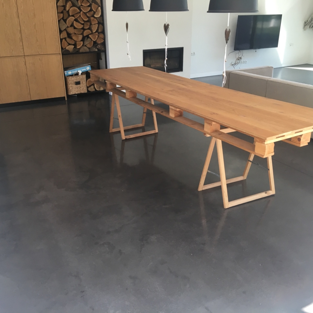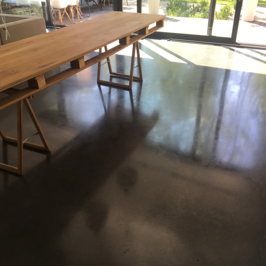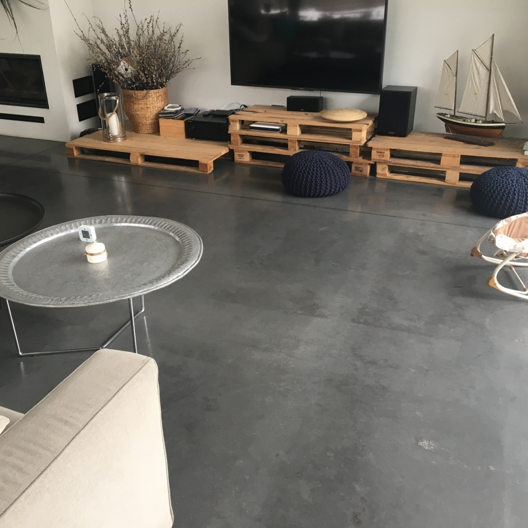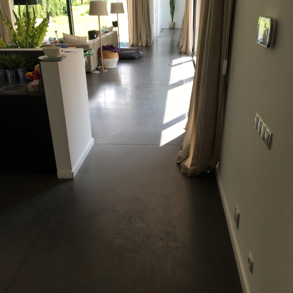 Posadzka betonowa ułożona na ogrzewaniu podłogowym z betonu posadzkowego C-25/30 z utwardzeniem powierzchniowym i zbrojeniem polipropylenowym. Beton polerowany w technologii Concre-tex z zabezpieczoną powierzchnią krzemianami litu.