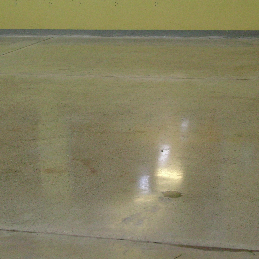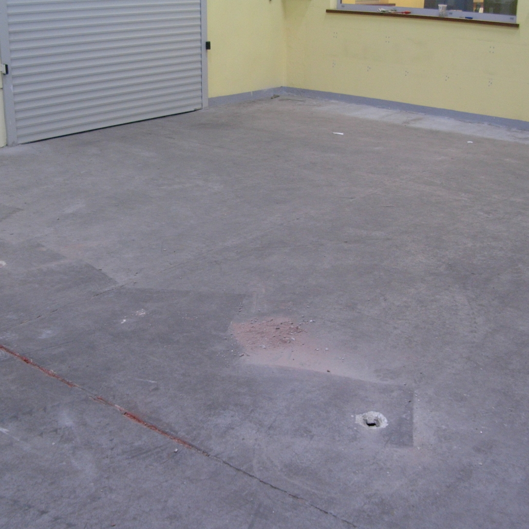 Budynek z lat 70-80 tych w Gliwicach przy ul. Portowej. Posadzka w bardzo złym stanie. Płyty podczas wykonywania były lane oddzielnie co dodatkowo wpłynęło na ich klawiszowanie. Beton mocno zużyty i pylący. Właściciel próbował już metod malowania, ale z krótkotrwałym skutkiem. Farba szybko się łuszczyła i wycierała, a pylenie zaczynało się powtarzać.